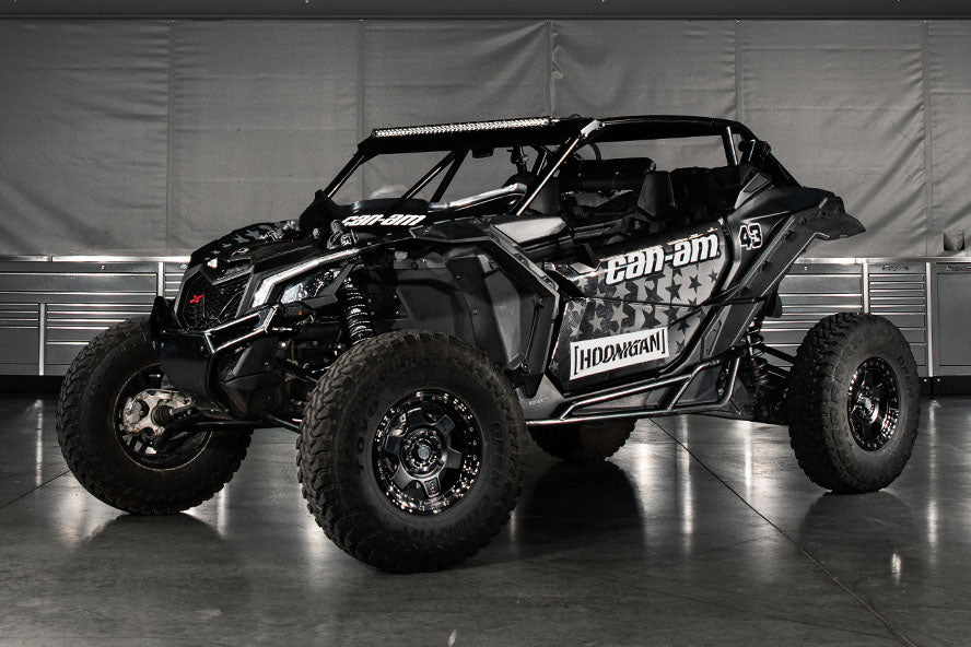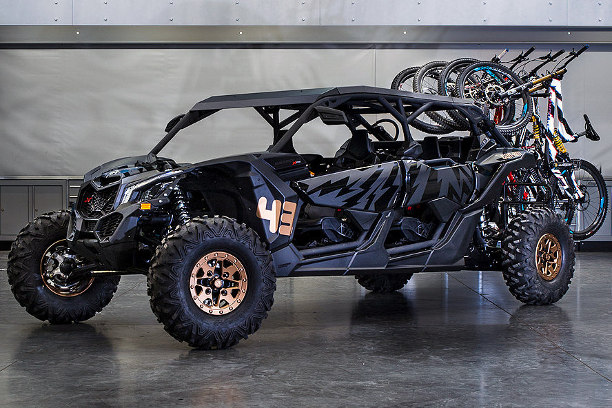 Body: 4-door, Maverick X3 MAX X rs with S3 Power Sports roof, custom paint and graphics inspired by Block’s Hoonicorn Mustang (v1) and his 2017 racecar livery art by Death Spray Custom. Also, custom 2 in. trailer hitch, North Shore mountain bike rack, and Can-Am street legal kit.