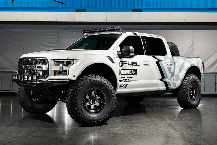 Body: 2017 Ford F-150 Raptor in Avalanche Gray with reflective-black Hoonigan Scatter Pattern vinyl graphics, SVC Offroad Gen2 Mojave Front Bumper with skid plate, SVC Offroad Gen2 Baja Rear Bumper, SVC Offroad Gen2 Bypass Rack with built-in storage for two full size spare tires, ADV Fiberglass +2 front fenders.