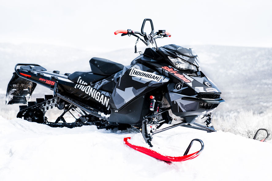 Ken Block's latest backcountry-hooning, powder-seeking, snow-shredding machine is a custom turbo’d, Ski-Doo Freedride 154 that features HOONIGAN's "Geo Drip" pattern.